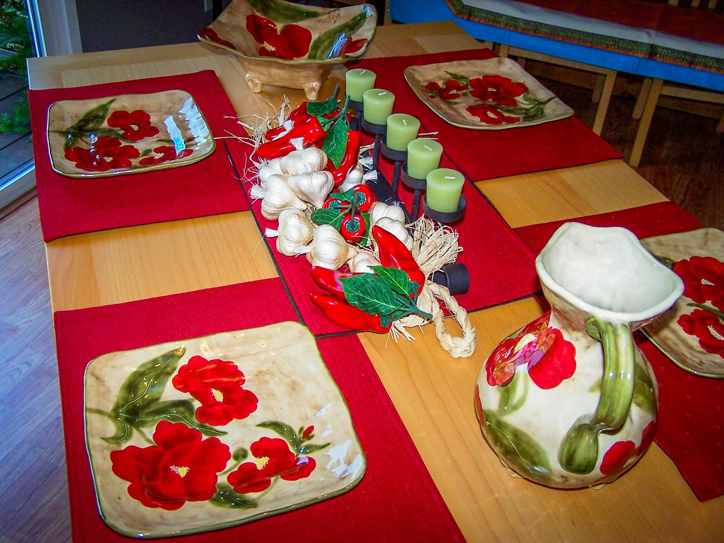 Table Centerpiece styling: red poppy dish ware styled with garlic, chili peppers and accents of soft earthy green with red placemats for a festive cross-cultural family event